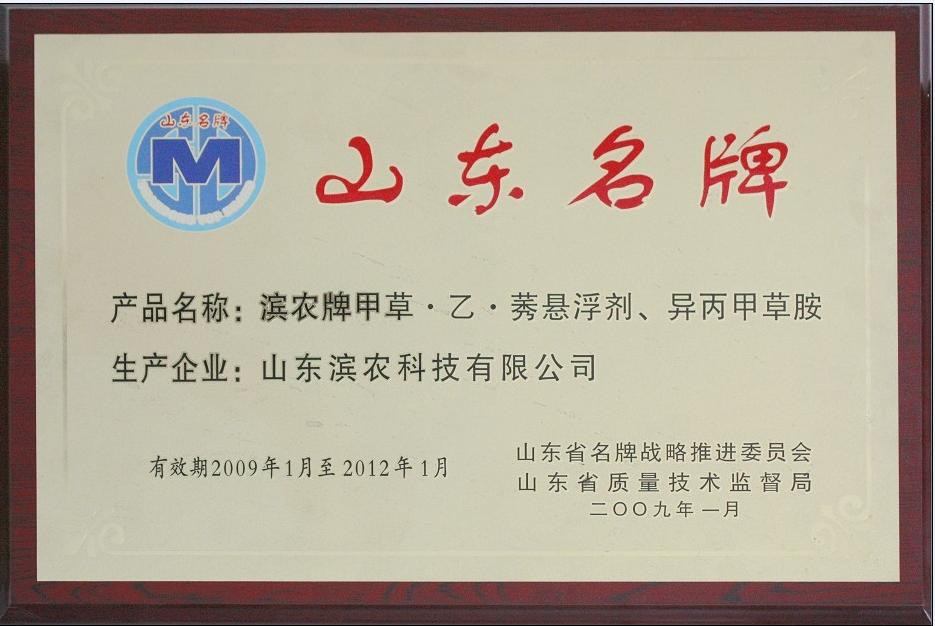 2009年1月,我公司甲草·乙·莠懸浮劑、異丙甲草胺兩個產品被山東省名牌戰略推進委員會評為“2008年山東名牌產品”。