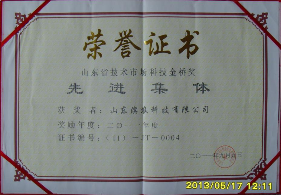 8 月29 日,經過山東省技術市場科技金橋獎評審委員會評審,我司被評為“山東省技術市場科技金橋獎先進集體”,董事長黃延昌被評為“山東省技術市場科技金橋獎先進個人”。9 月 25 日,在萊蕪舉行了隆重的頒獎儀式。