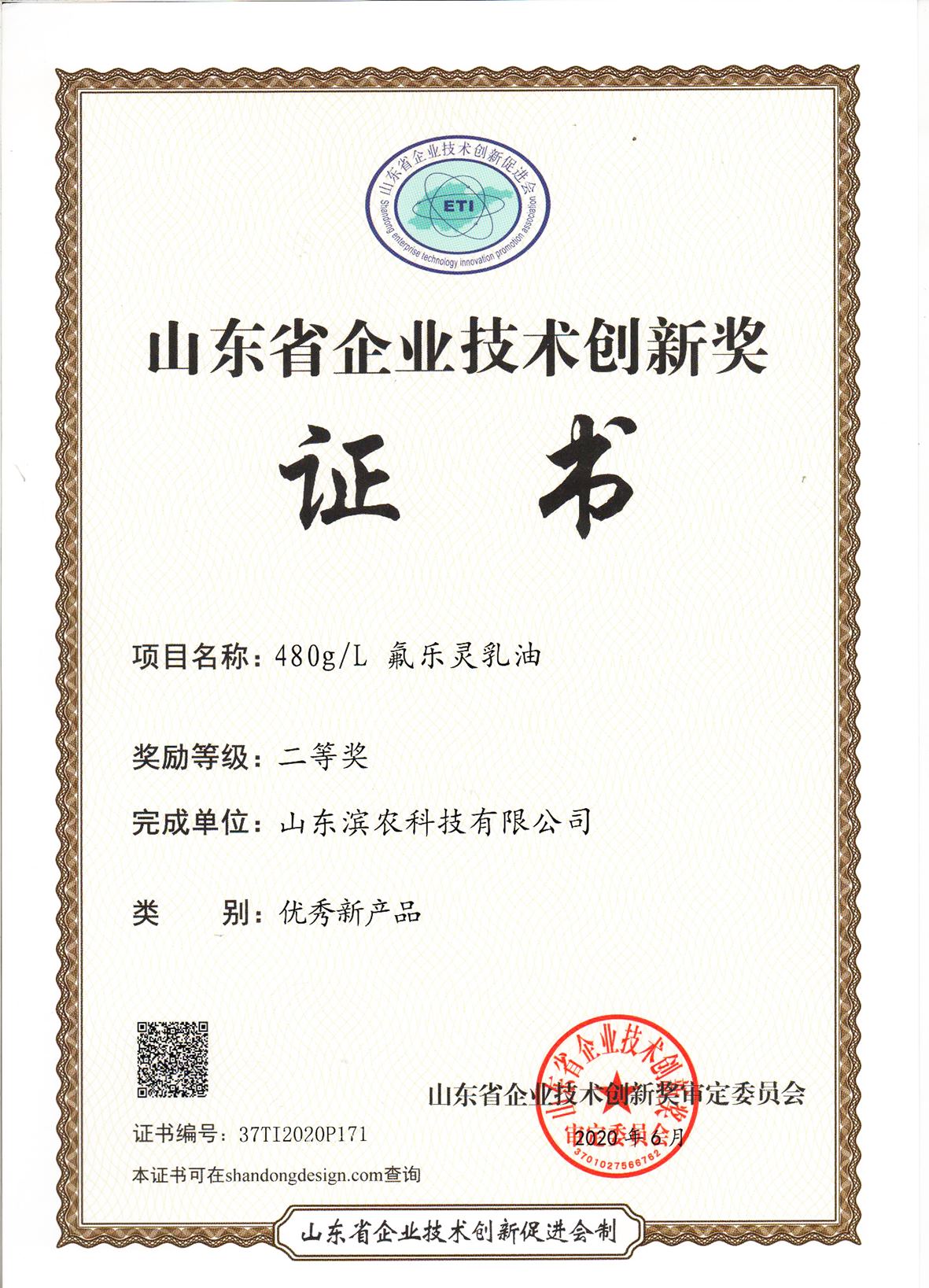 ■2021-04-08 2020-08-05 我公司新產(chǎn)品480g/L氟樂靈乳油榮獲山東省企業(yè)技術(shù)創(chuàng)新獎(jiǎng)優(yōu)秀新產(chǎn)品二