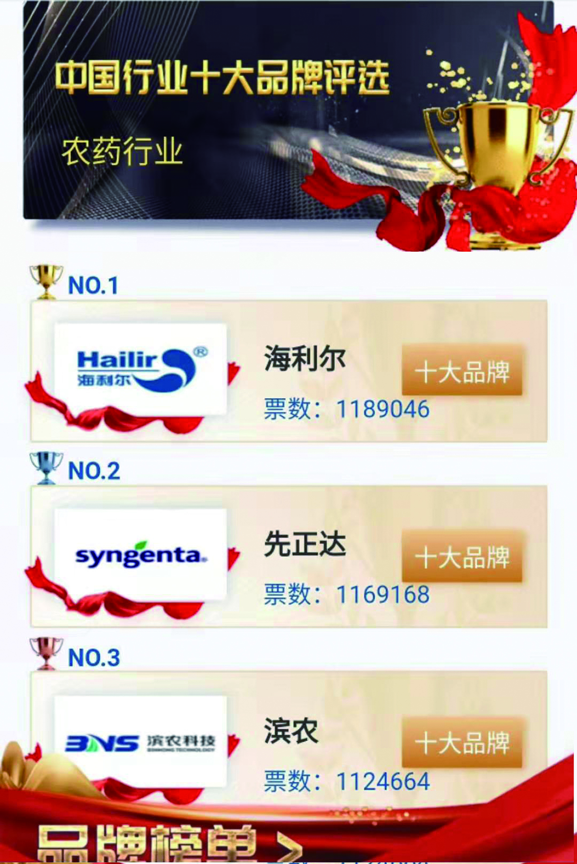 2019年度中國農藥行業十大品牌評選結果揭曉,濱農科技以1124664票獲評第三