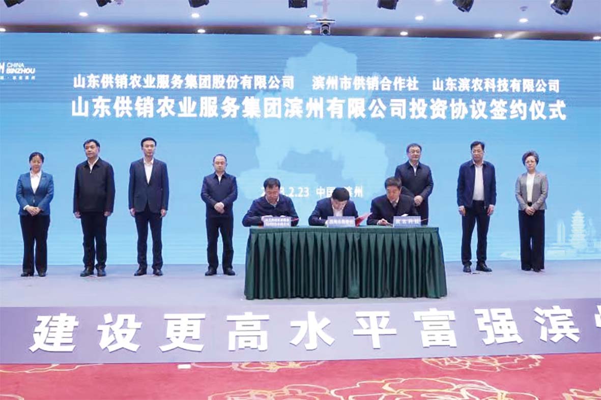 張傳忠、李春田為“濱州市供銷農業社會化服務聯合體”揭牌。省供銷社黨組成員、監事會副主任張榮慶,副市長畢志偉代表山東省供銷合作社、市政府簽訂了戰略合作協議。山東供銷農業服務集團股份有限公司與濱州市供銷社、山東濱農科技有限公司簽訂了山東供銷農業服務集團濱州有限公司投資協議;濱州市供銷社與山東能源集團國際酒店有限公司簽訂戰略合作協議。