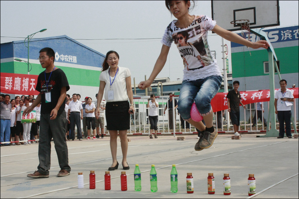 開幕式上,濱農(nóng)禾韻藝術(shù)團(tuán)團(tuán)員高舉藝術(shù)團(tuán)團(tuán)旗走在前列,各參賽運動員代表本隊依次展示入場。副總經(jīng)理孟令濤擔(dān)任總裁判長,并熱情洋溢地致開幕詞。比賽項目包括跳繩、拔河、單腳火車跑、“迷你”鐵人三項和雙腿夾球接力五項,各項目雖簡單快樂有趣,卻非常考驗運動員之間的配合和默契。
